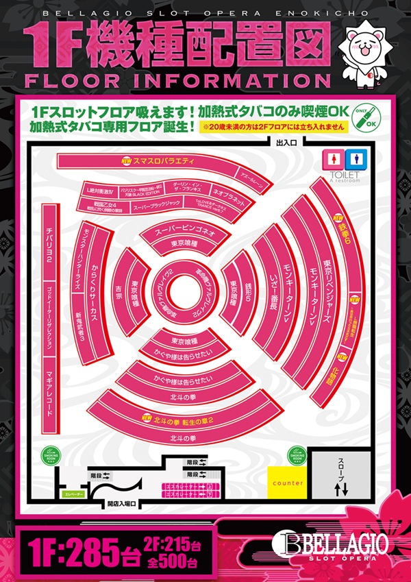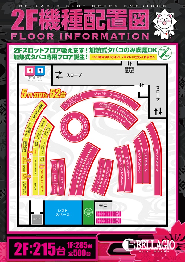 | 台数 | パチンコ/スロット:500台 |